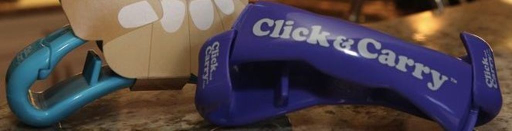 Click & Carry is a handle device that allows shoppers to manage & carry multiple bags at once ~ comfortably; either in the hands or worn over one's shoulder
