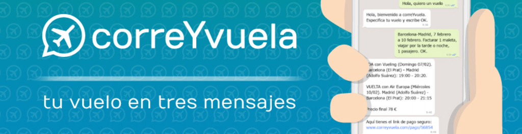 correYvuela (Chatnfly para mercados internacionales) es un chatbot que permite al usuario obtener sus vuelos en tres mensajes en español y en inglés en cualquiera de las mensajerías instantáneas favoritas del usuario (WhatsApp, Facebook, SMS y Telegram).