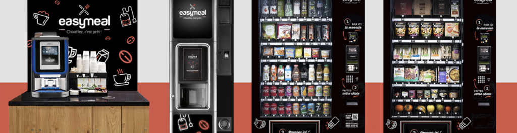 Easymeal propose une solution innovante de distributeurs modernes et esthétique, avec une large offre variée, saine et gourmande (plus de 600 références allant de la pause café à la restauration complète), et le tout ficelé par une logistique connectée et optimisée.