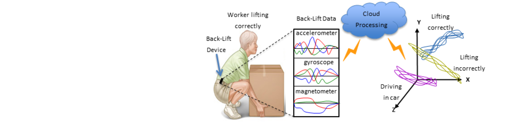 A wearable device records movements of the lumbar spine, processed in the cloud to identify at-risk behaviors, providing feedback to reduce work injuries