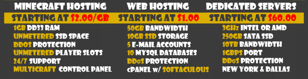 Glowstone Servers is a newly founded company that is from Denver, Colorado. We strive to have the lowest prices and the best customer support possible. We have all owned servers and websites and we feel the need to keep the prices low for everyone. Not everybody can afford to pay $100/year just to have fund and play with friends. That is why we decided to found Glowstone Servers. Our team is around 24 hours a day, 7 days a week to help.