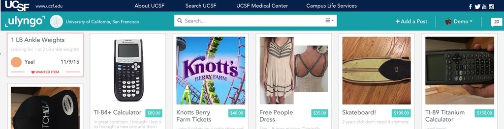 Ulyngo is a marketplace solution for Universities that enables their students to buy/sell/promote goods, services, and events to peers at their school.